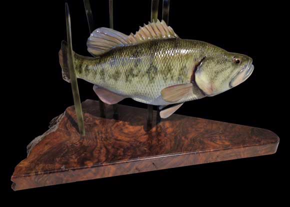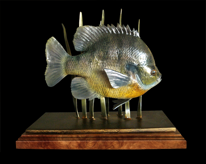 Both the bass and bluegill sculptures are cast in bronze. Both sculptures attached to the base by welding the pectoral fins to the bronze “cattails”. We just finished a new base for the second bass sculpture by securing a steel plate underneath the walnut and welding everything from the bottom. That was one of the nicest pieces of walnut burl we've been able to find.