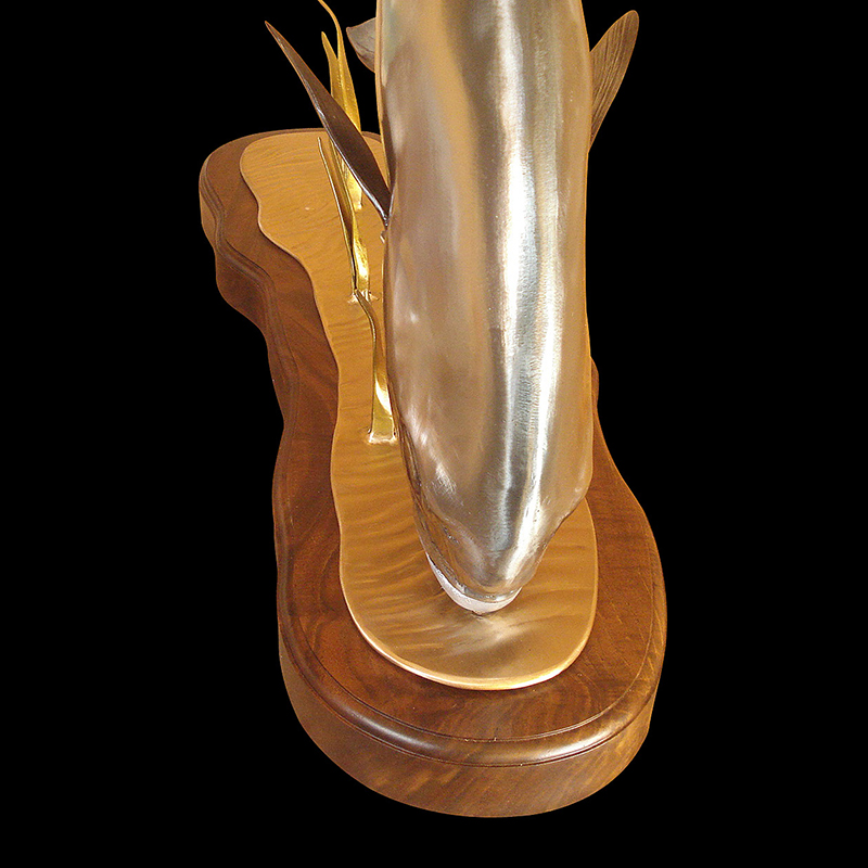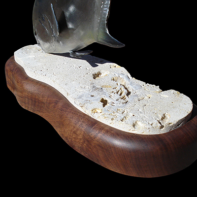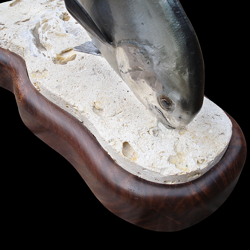 As with a tarpon or bonefish, there's not a more perfect metal for a permit than stainless steel. The combination of polished steel, stone, and a beautiful burl base is special to me. We have access to many varieties of very special burl so please let us know what you prefer.