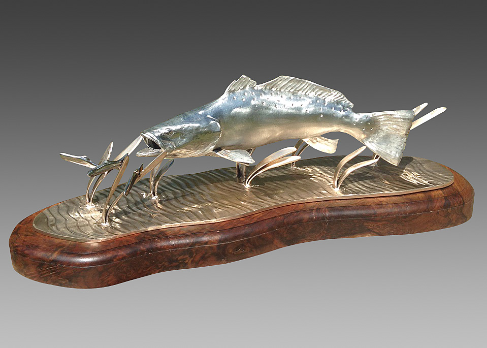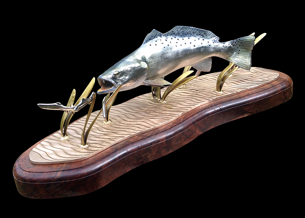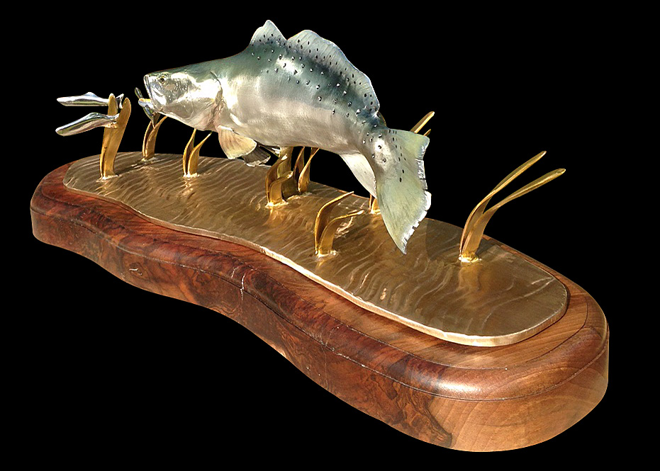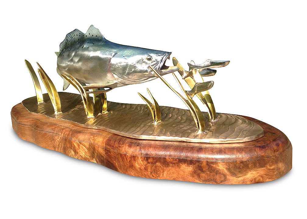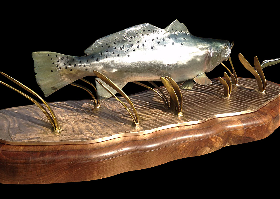 This is one of my favorite sculptures. There isn't a more perfect metal to cast a bright speckled trout that stainless steel. It also re-creates one of my favorite scenes in fishing.......watching an aggressive trout chasing baitfish in shallow water and seeing the bait shoot out of the water looking like little silver blurs.