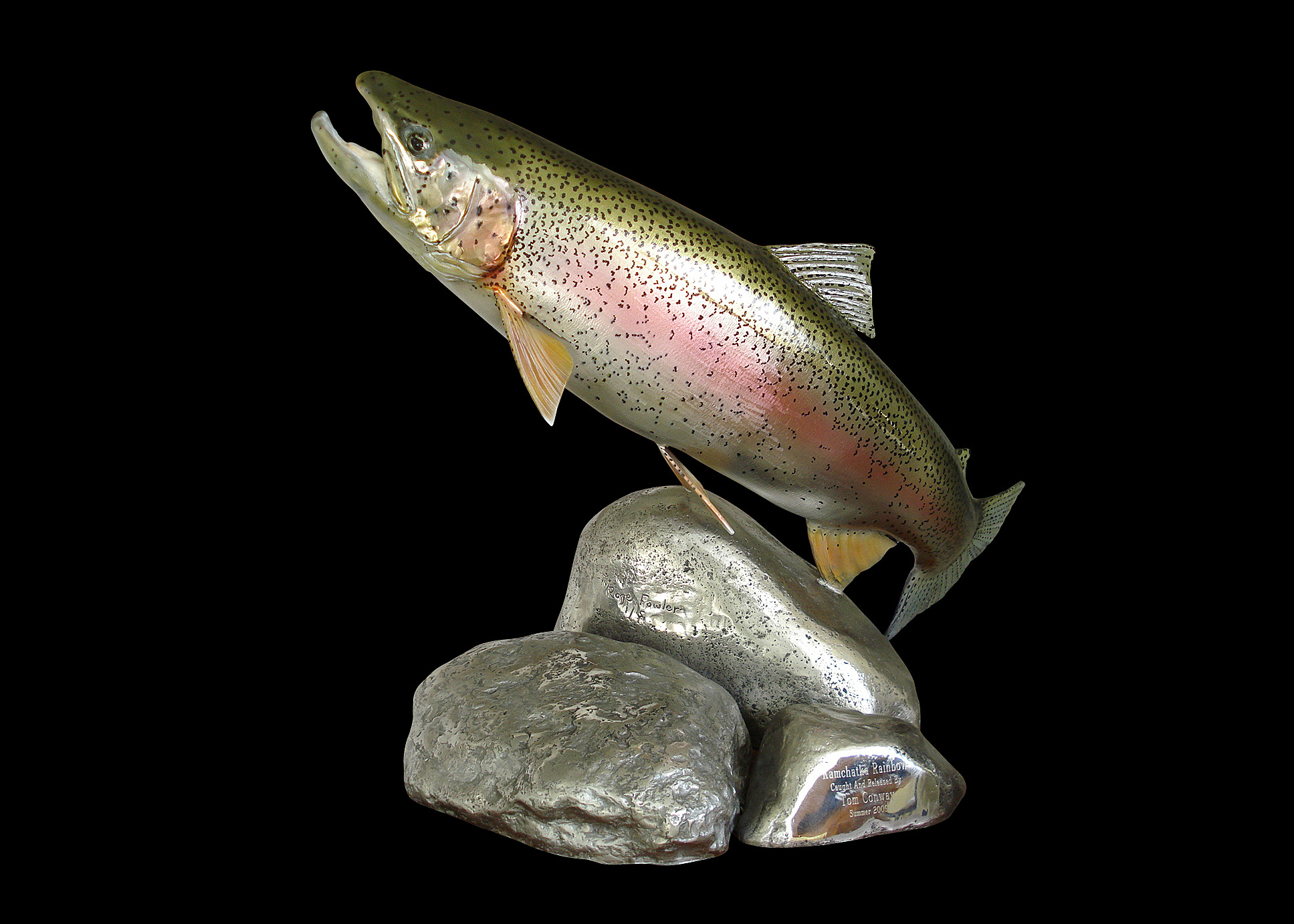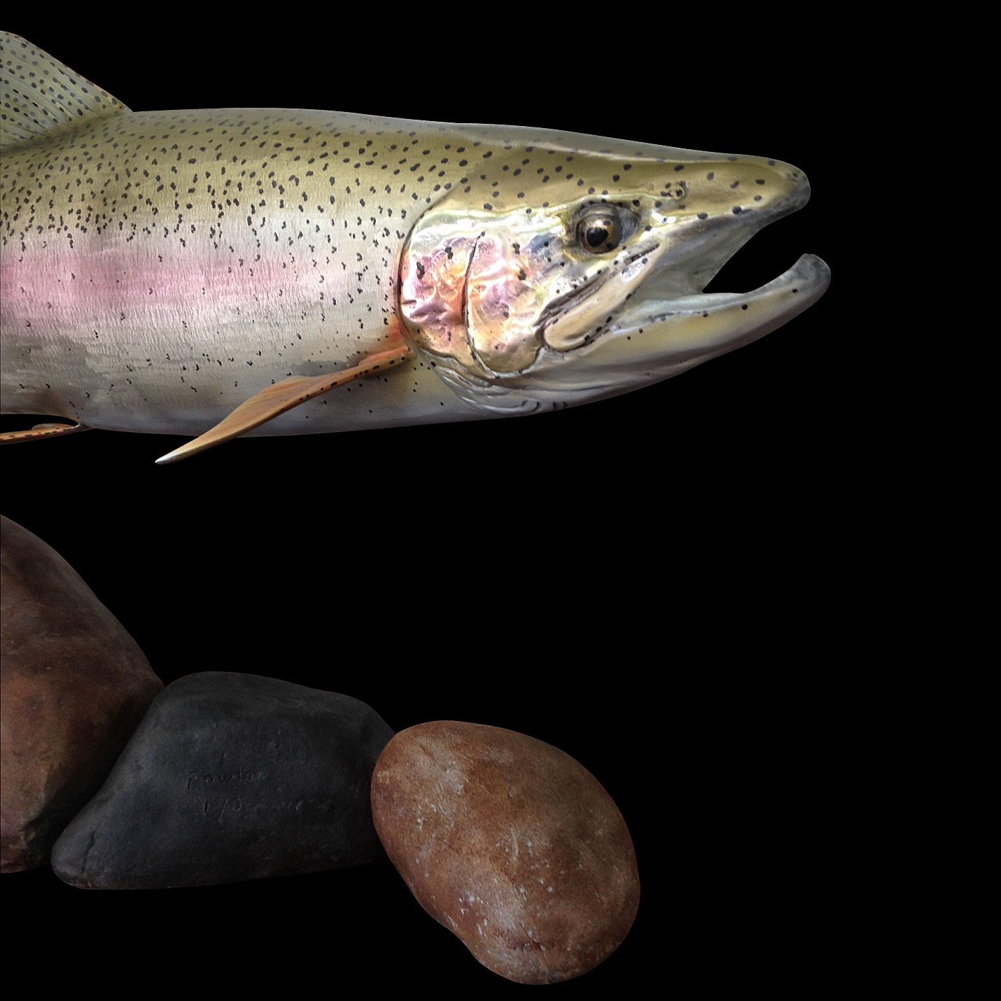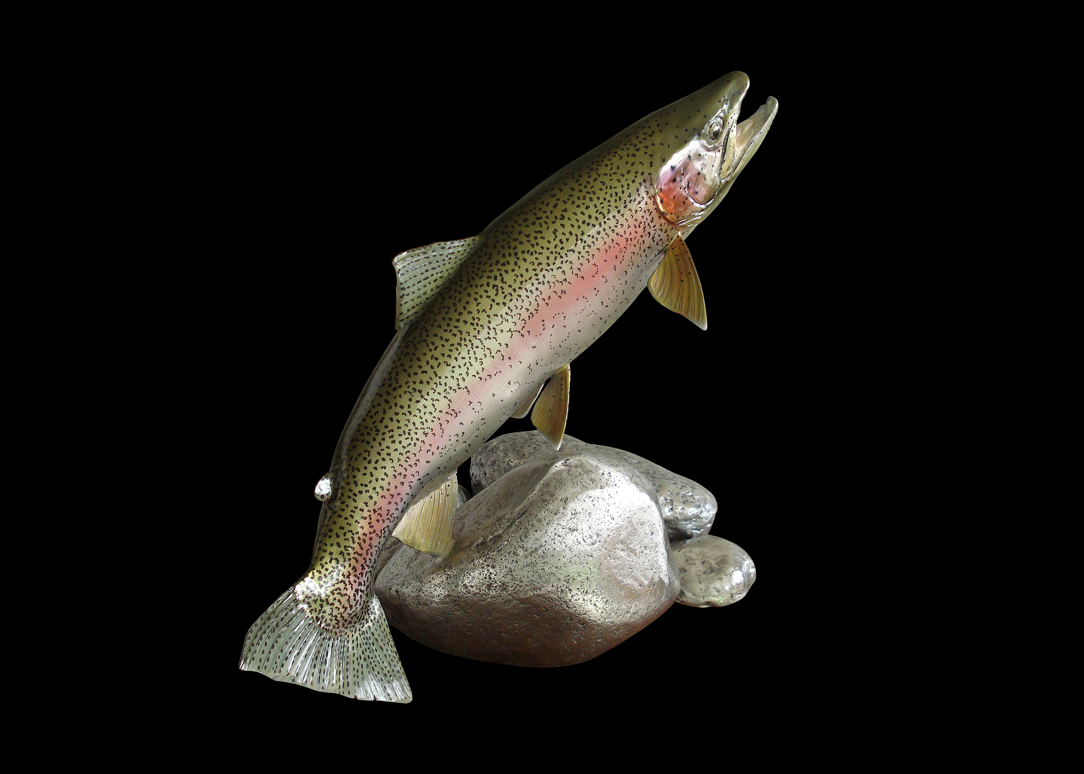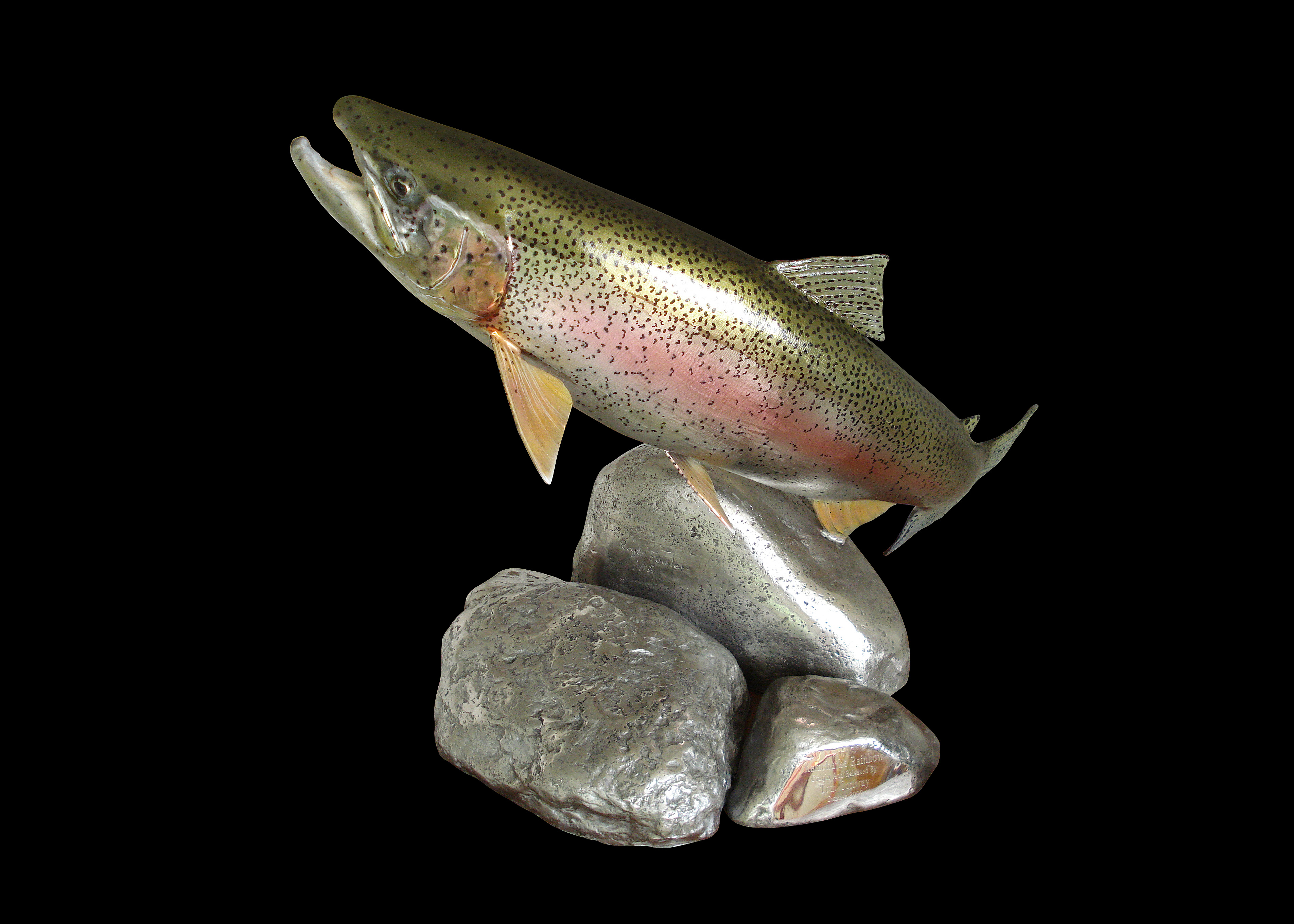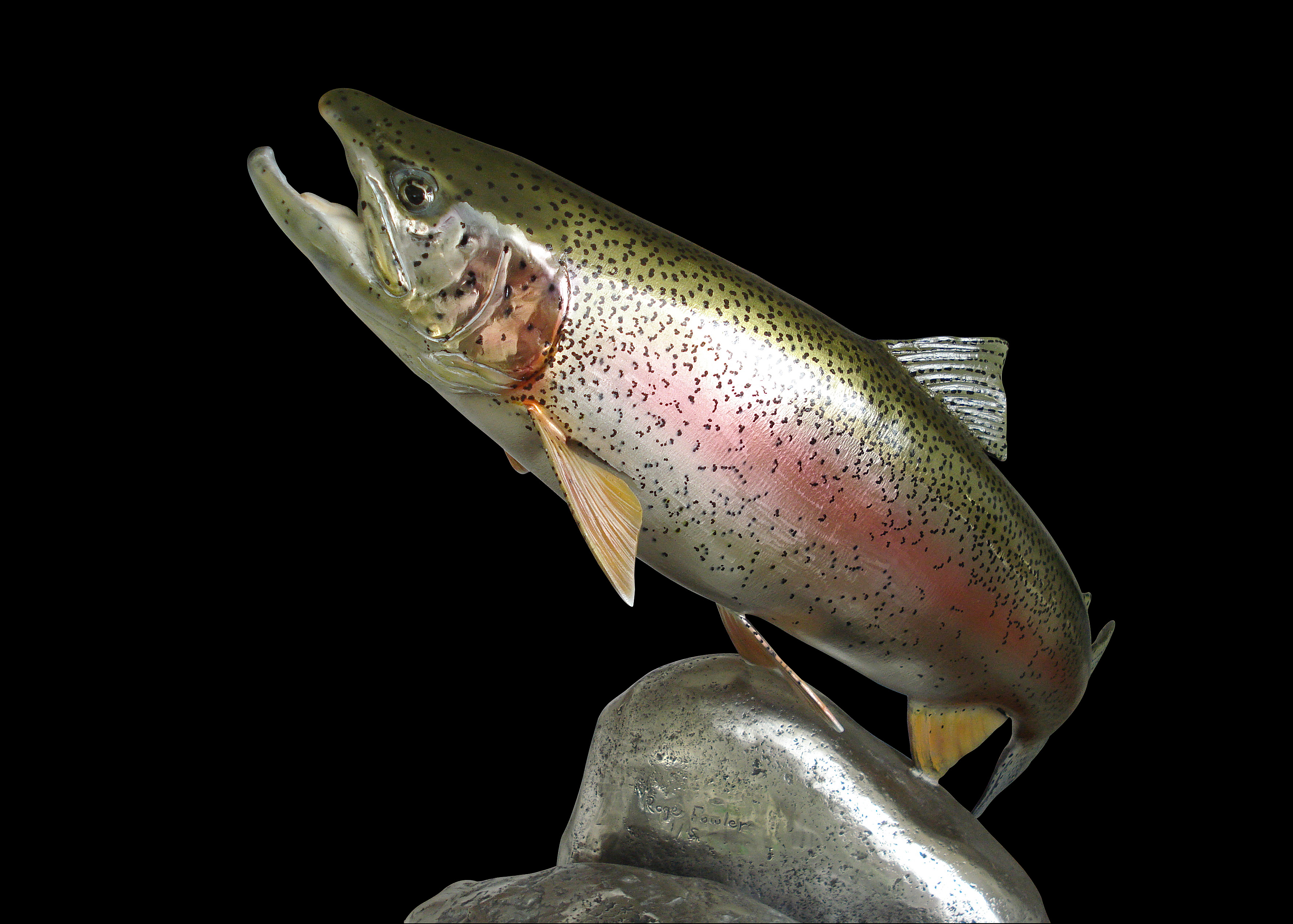 Notes: On the large 29” and 30” rainbows we can alter the angles and the size of the bronze or steel “rocks” to fit any size requirement you might have. I'm also interested in making two or three new trout sculpture editions this year so please give me a call if you'd like to have a size that's not shown. Every trout is a little different. In a river and in my studio. If you'll send me your photos I can make you something very special.