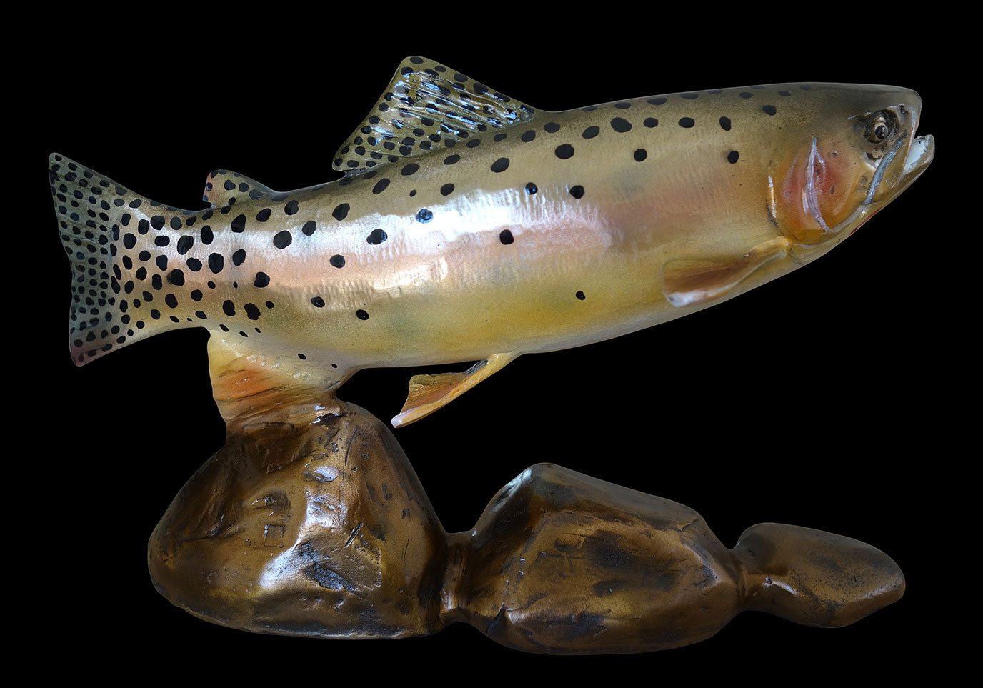 I think that trout are the most beautiful fish in existence and their images have a chance to make some of the most beautiful sculpture. We polish the metal and add a very transparent patina that allows the light to reflect off of the metal and back through the transparent color...........much like a live fish.