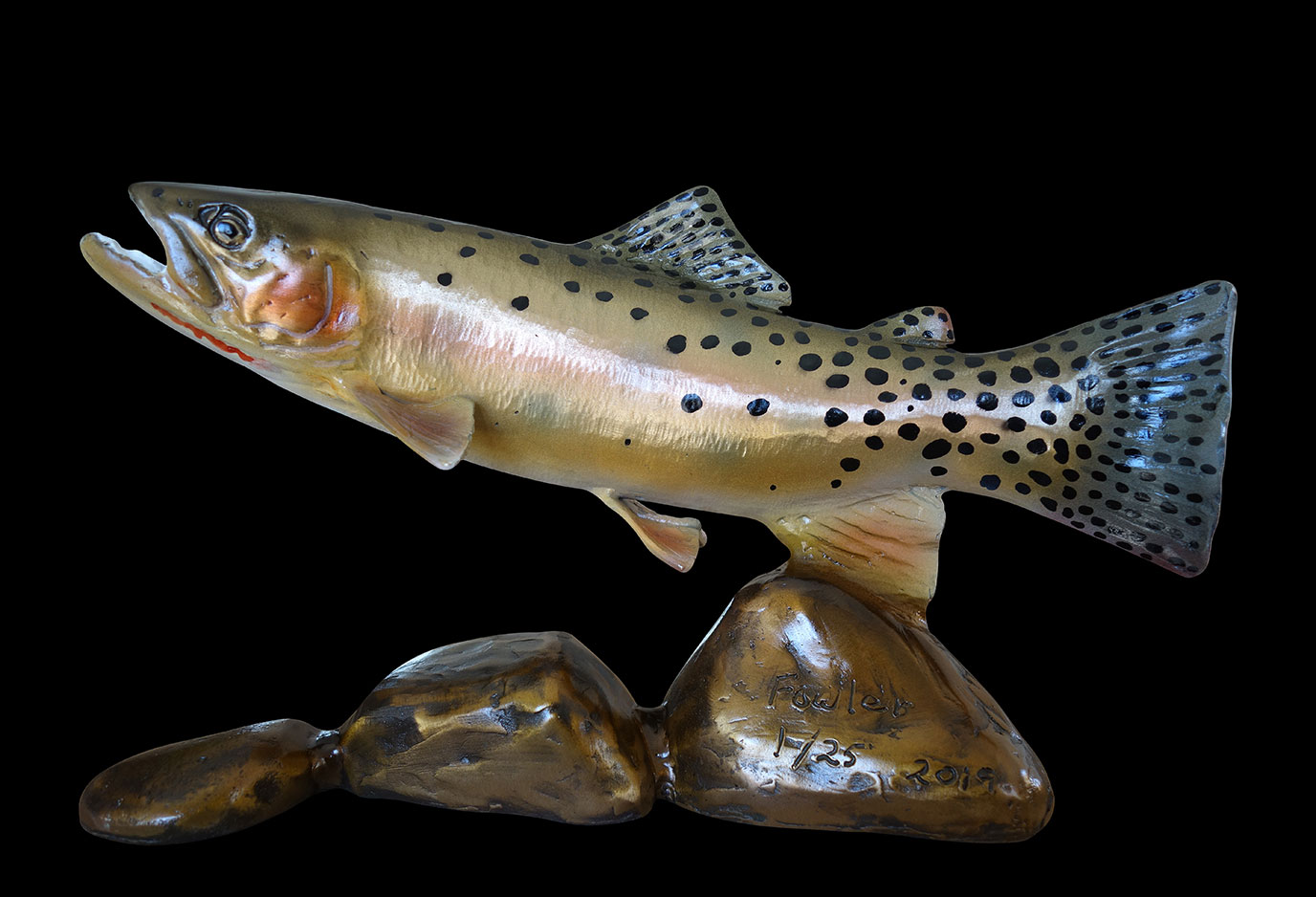 "I've never seen a trout sculpture that rivals yours. The way you polish and texture the metal and then add a transparent patina is unprecedented. The sculpture actually reflects light like a live trout. Congratulations."Art Bond